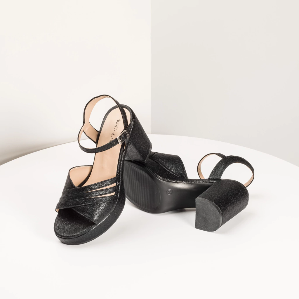 Sandalias taco medio con brillos y tiras cruzadas en empeine